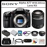 Sony Alpha A77 w/55-200mm Lens Kit Includes: Sony Alpha A77 Digital Camera with 55-200mm Lens, 2x Telephoto Lens, 0.45x Wide Angle Lens, 16GB SDHC Memory Card, Memory Card Reader, 3 Piece Filter Kit (UV-CPL-FLD), Extended Life Battery, Rapid Travel Charger, HDMI Cable, LCD Screen Protectors, Table Top Tripod SSE Microfiber Cleaning Cloth and Soft Carrying Case the link below
