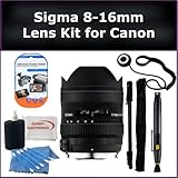 Sigma 8-16mm F4.5-5.6 DC HSM Ultra-Wide Zoom Lens Kit for Canon EOS 20D, 30D, 40D, 50D, 60D, 7D Digital SLR Cameras. Also Includes: Lens, Lens Cap Keeper, Lens Cleaning Pen, Monopod, LCD SCreen Protectors, and Cleaning Kit with SSE Microfiber Cleaning Cloth the link below