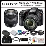 Sony Alpha A77 Kit Includes: Sony Alpha A77 Digital Camera with 18-55mm and 16-50mm Lenses, 2x Telephoto Lens, 0.45x Wide Angle Lens, 16GB SDHC Memory Card, Memory Card Reader, 3 Piece Filter Kit (UV-CPL-FLD), Extended Life Battery, Rapid Travel Charger, HDMI Cable, LCD Screen Protectors, Table Top Tripod SSE Microfiber Cleaning Cloth and Soft Carrying Case the link below